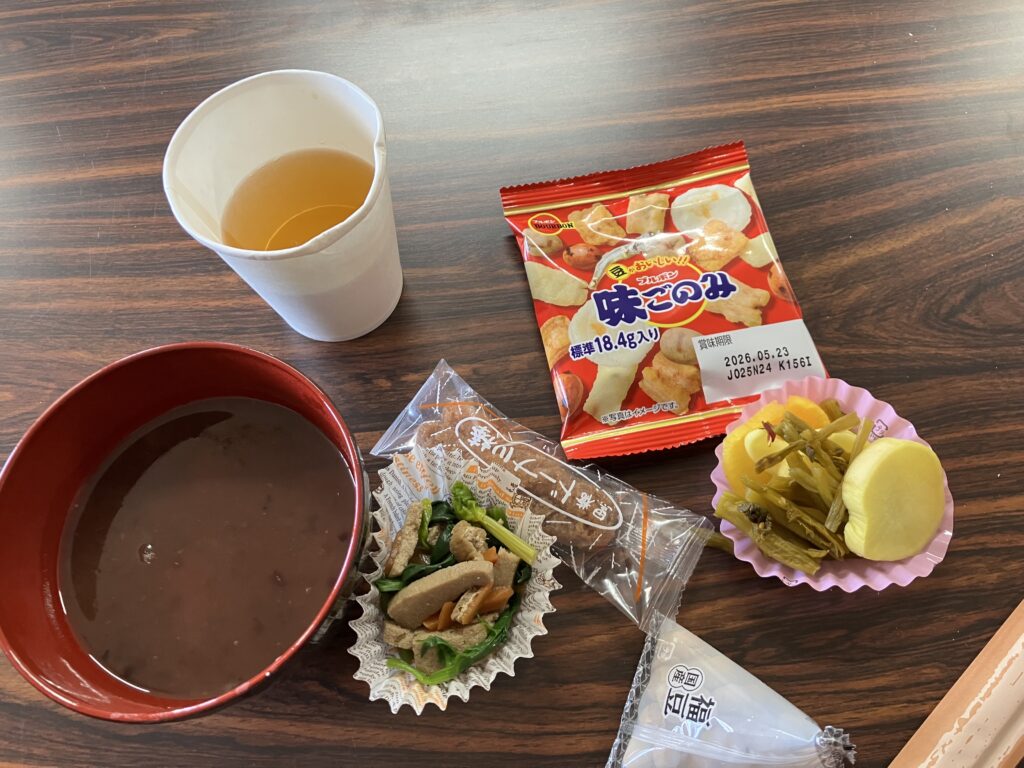 スタッフの配慮で、パソコンに水がかかってはいけないと、飲まず食わずの勉強会の後、一寸焦げた匂いが立ち込めたぜんざい、お漬物(何人もの方々の手作り沢庵やら高菜漬けやらの差し入れ有難うございました)。 なべちゃんのお菓子にゆうすげさんの味好み、山形風「冷やしる」に福豆と御膳一杯に並んで大ニコニコでいただきました。