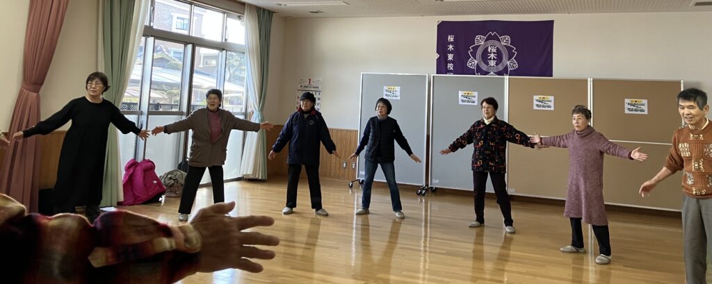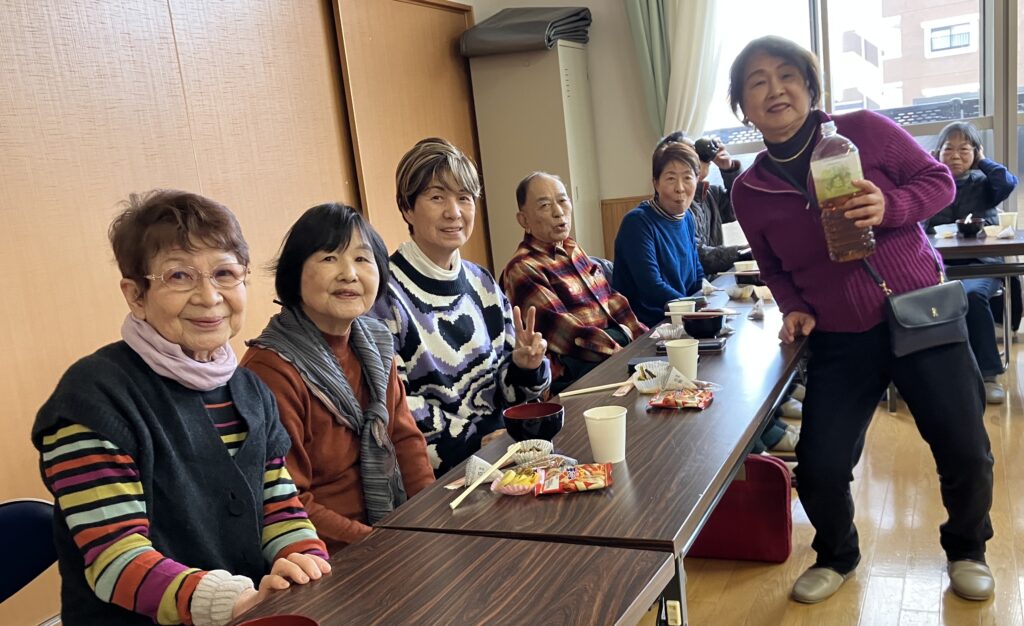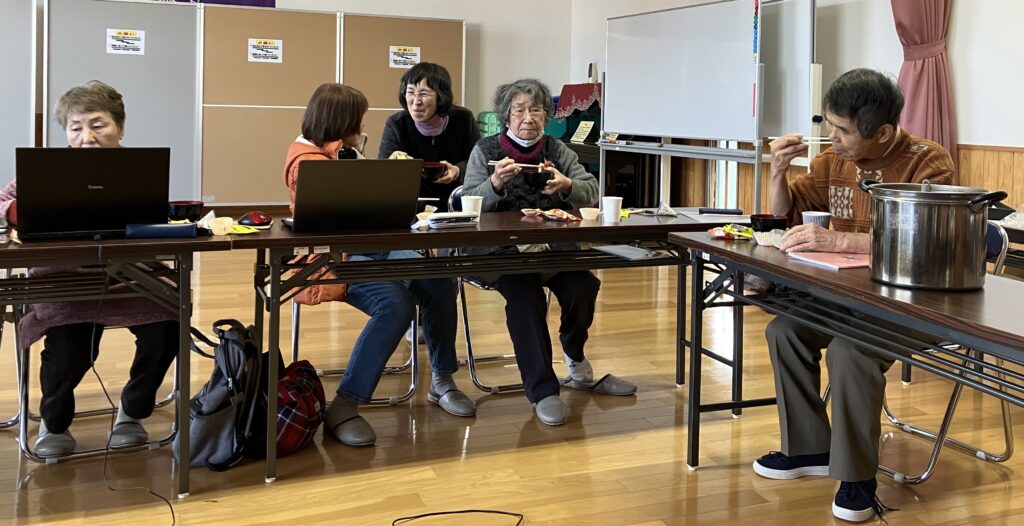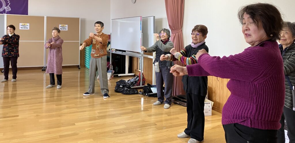 御ぜんざいもおかわりしたり、おなか一杯になったところで、信子さんの健康体操。机を片付けて、広いフロアで輪になって365日のマーチを大声で歌いながら体操をしました。そしてしりとり(野菜とか果物とか)をしながら健康体操を繰り返して、大満足で散会しました。